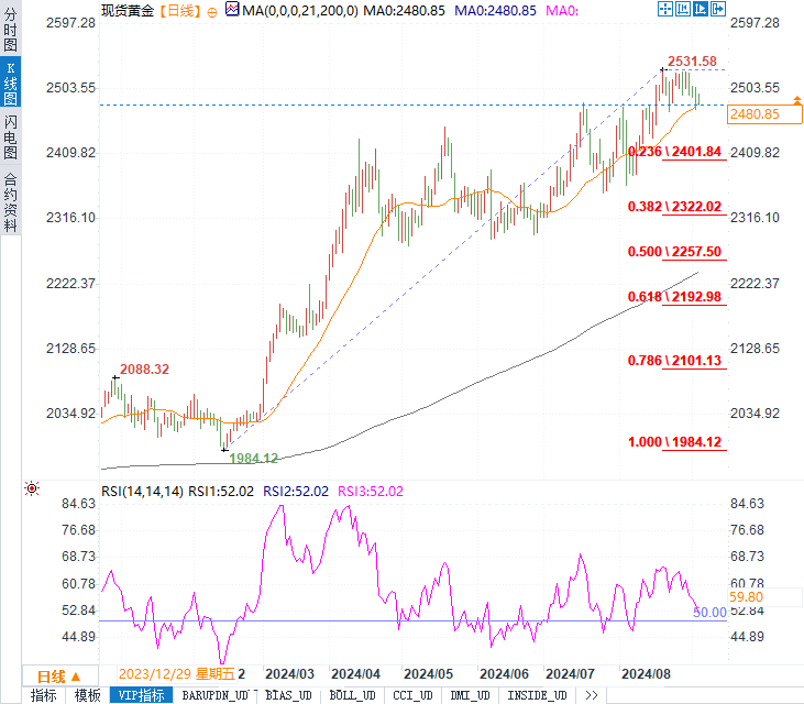 从技术面来看,黄金价格近期的走势显示出一定的修正压力。当前金价在2480美元/盎司附近波动,而21日均线位于2484美元/盎司,这是一个关键的短期技术支撑位。如果金价在未来的交易日内跌破这一水平,多头可能会面临更大的压力。