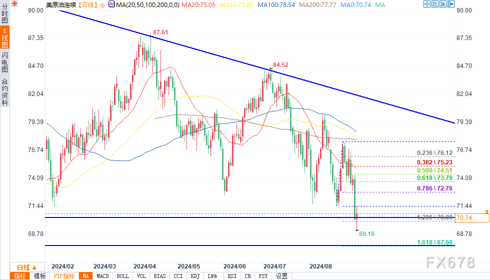 下行方面,8月5日以来的低点71.17美元已经被跌破。从这里开始,68.00美元的重要支撑关口是第一个值得关注的水平,其次是67.11美元,这是自2023年6月的三重底部以来的最低点。
