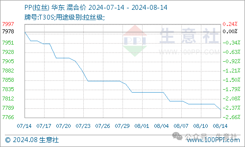 据生意社商品行情分析系统,8月前半月PP市场延续弱势整理行情,各牌号产品价格窄幅下跌。截止8月14日,国内生产商、贸易商拉丝主流报盘价格在7785.71元/吨左右,较月初下跌0.55%。