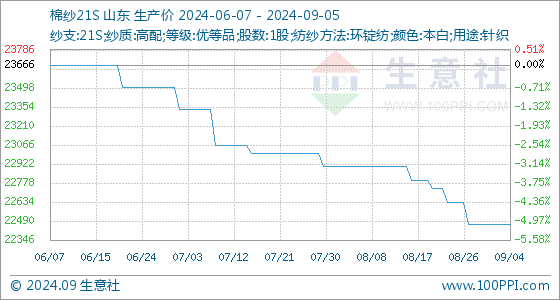 9月5日,生意社棉纱21S基准价为22466.67元/吨,与本月初持平。