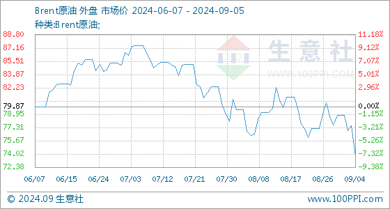 9月5日,生意社Brent原油基准价为73.75美元/桶,与本月初(78.82美元/桶)相比,下降了-6.43%。