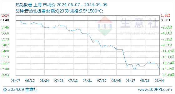 9月5日,生意社热轧板卷基准价为3126.00元/吨,与本月初(3232.00元/吨)相比,下降了-3.28%。