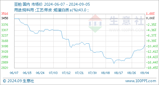 9月5日,生意社豆粕基准价为3124.00元/吨,与本月初(3052.00元/吨)相比,上涨了2.36%。