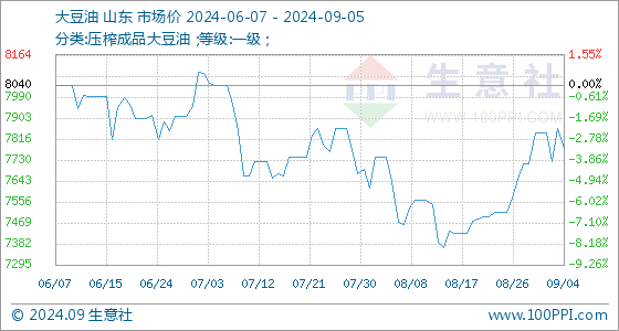 9月5日,生意社大豆油基准价为7780.00元/吨,与本月初(7842.00元/吨)相比,下降了-0.79%。