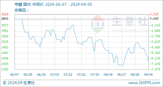 9月5日,生意社甲醇基准价为2425.00元/吨,与本月初(2480.00元/吨)相比,下降了-2.22%。