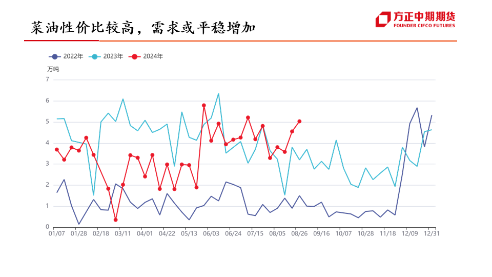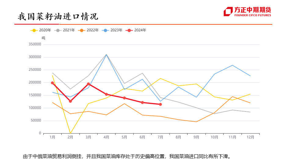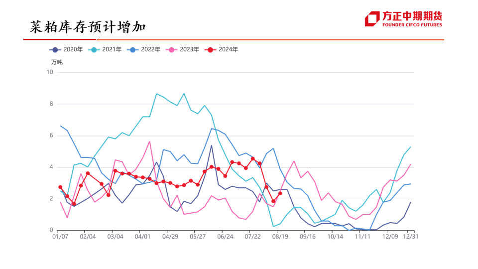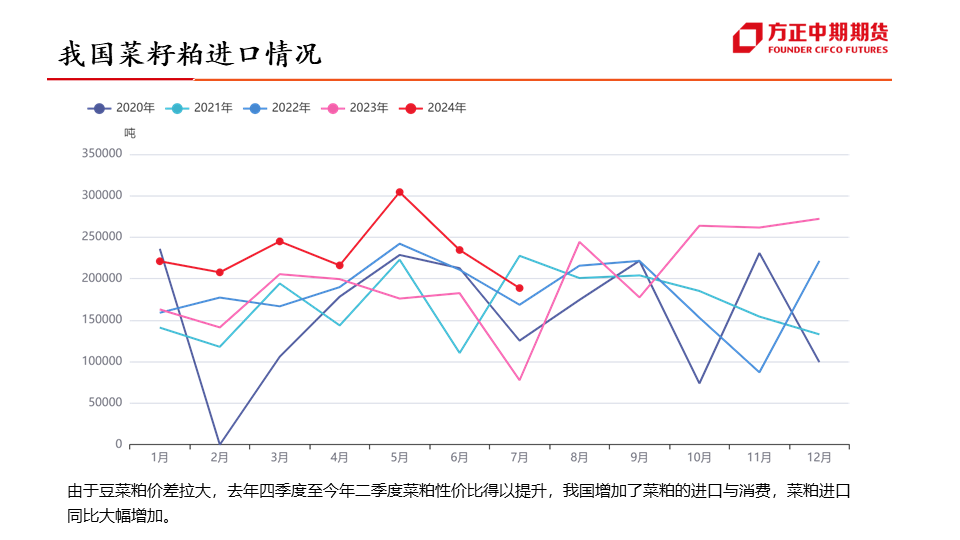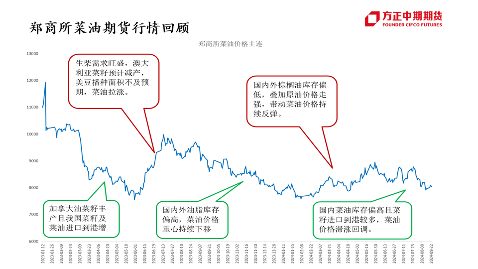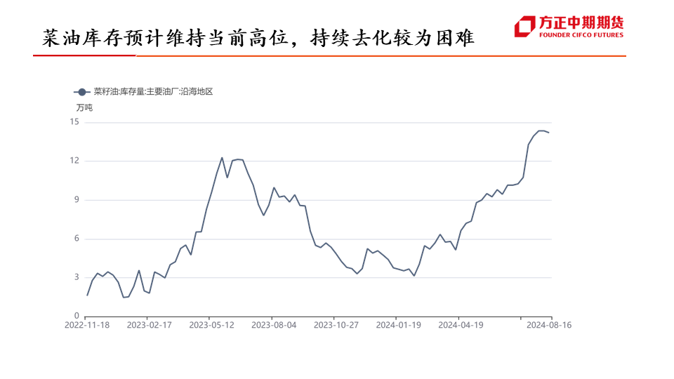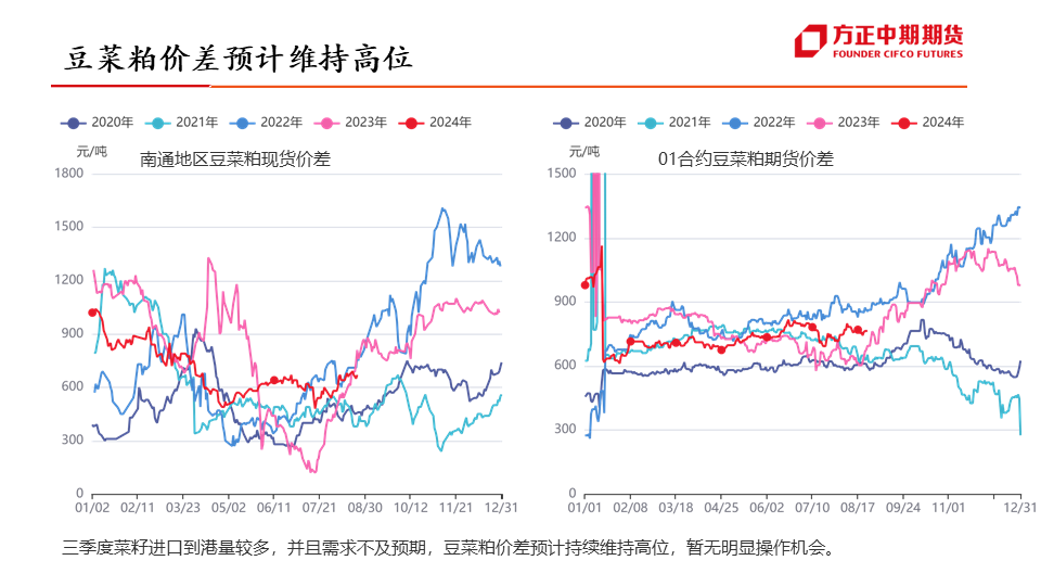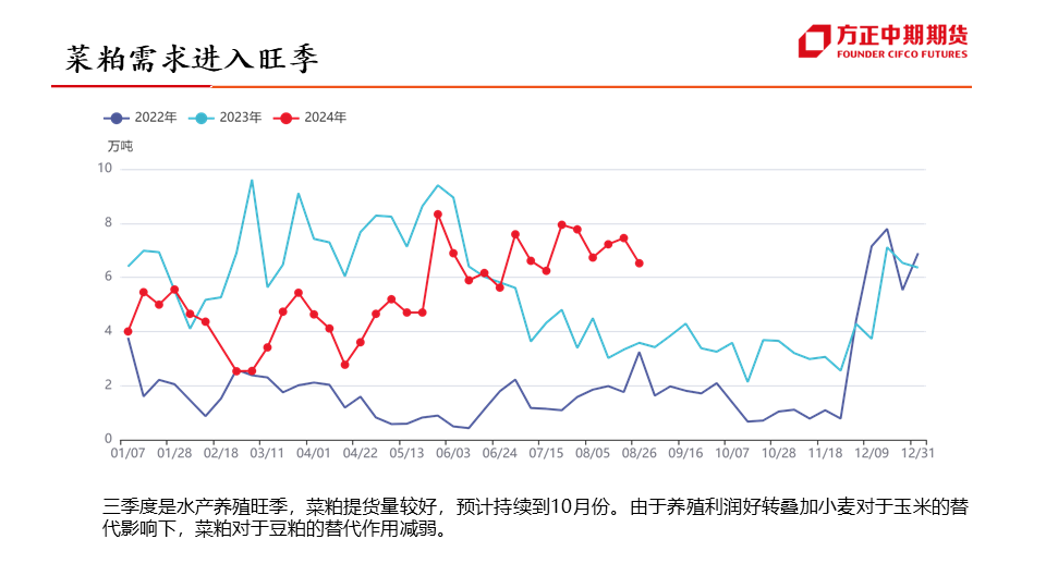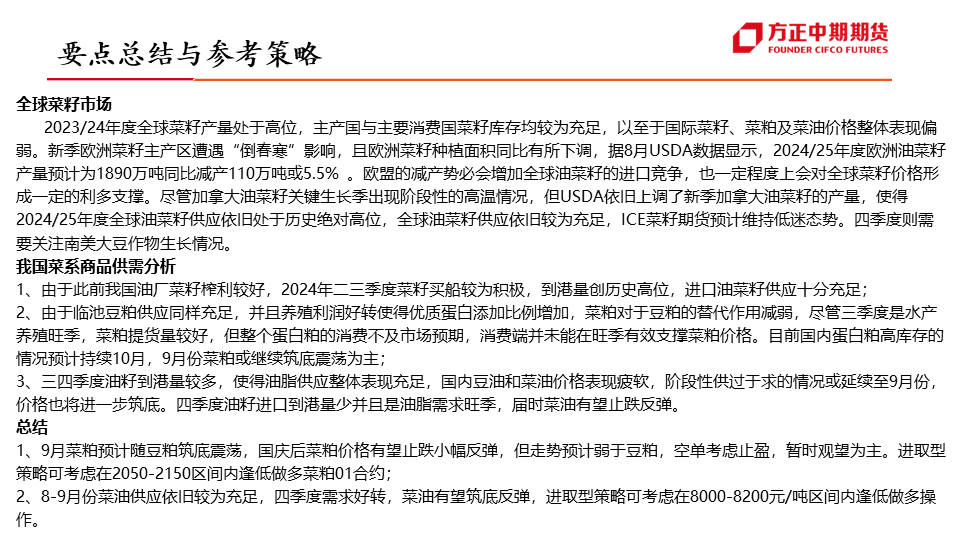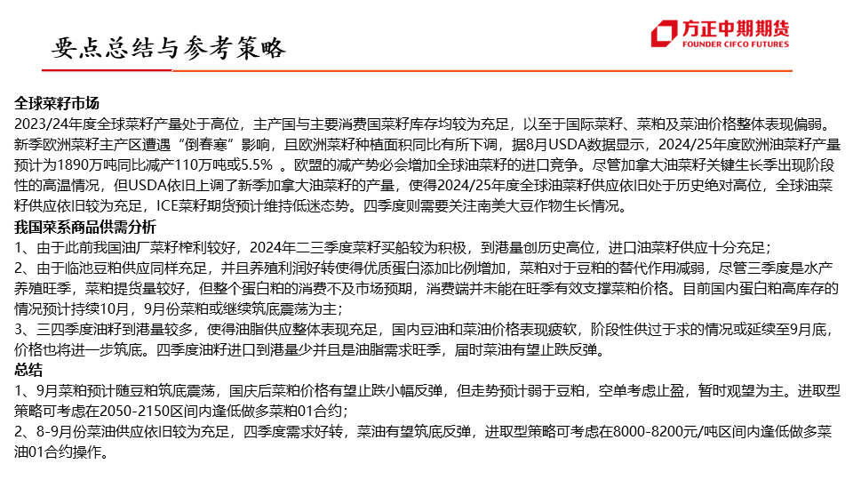 行情展望:菜油:四季度为菜油传统需求旺季,对菜油价格有一定支撑作用,但随着加菜籽集中到港,菜油库存预计将逐步企稳,或抑制菜油价格上行空间,叠加美国高利率、原油宽幅波动的影响,预计四季度菜油维持宽幅震荡运行,波动区间或在7900-9600元/吨。菜粕:四季度为菜粕传统消费淡季,抑制菜粕价格上涨,且随着加菜籽集中到港,菜粕价格或有进一步下滑,但因船期到港时间尚不确定,或引发“强现实,弱预期”的博弈,预计四季度菜粕震荡偏弱运行,重心或有进一步下移可能。...