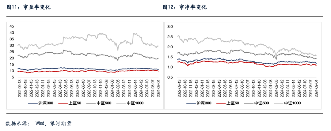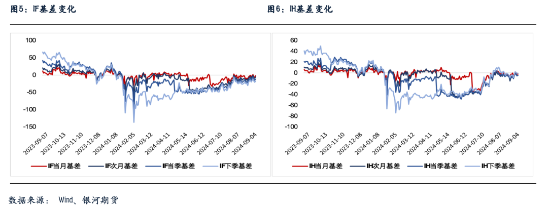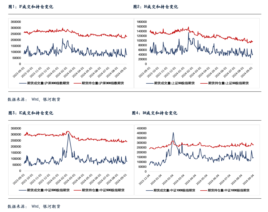 股指期货随现货回落,至收盘,主力成交合约IH2409跌0.87%,IF2409跌0.59%,IC2409跌0.17%,IM2409跌0.24%。各品种基差小幅上行,贴水略有收敛。IC、IF和IH成交分别增加4.8%、0.4%和8.6%,IM成交无变化。IC、IF和IM持仓分别下降0.7%、0.6%和2.1%,IH持仓小幅增加0.1%。