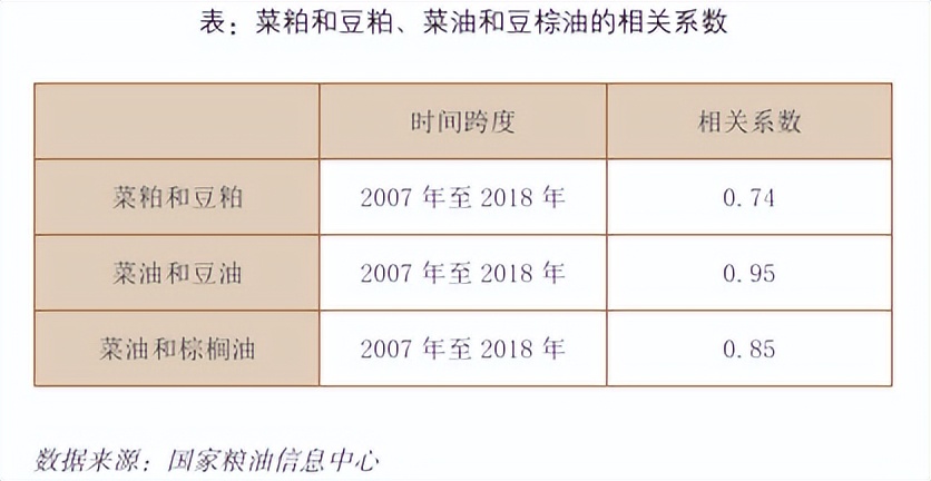 菜籽和产品的供需分析不能脱离其他油脂油料品种而单独进行,统计发现,菜粕和豆粕的价格高度相关,菜油和豆油、棕榈油的价格高度相关。