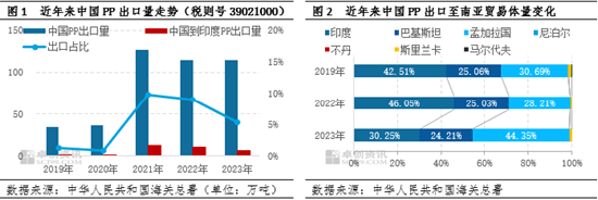 印度一直是中国在南亚地区重要的出口贸易伙伴,其人口基数庞大、劳动力丰沛,逐渐吸引制造业企业在当地建厂也推动了印度快速发展,因此对于PP原料需求较为强劲。由于中国PP价格长期处于洼地水平,出口窗口多次打开,叠加地理位置优势创造了出口机会,让大量PP货源进入印度,近几年出口贸易体量占比达到出口至南亚地区贸易体量的三分之一。