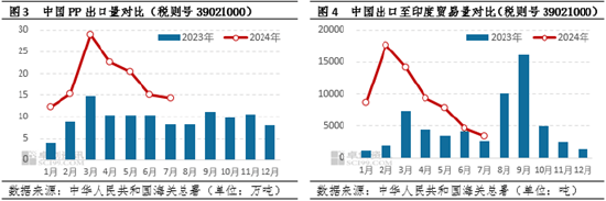 2024年1-7月PP出口量(税则号39021000)同比继续增加,据中华人民共和国海关总署数据显示,PP出口量128.70万吨,同比增加92.35%。其中对印度出口量在6.596万吨,同比增加157.19%,出口到印度的体量继续提升。