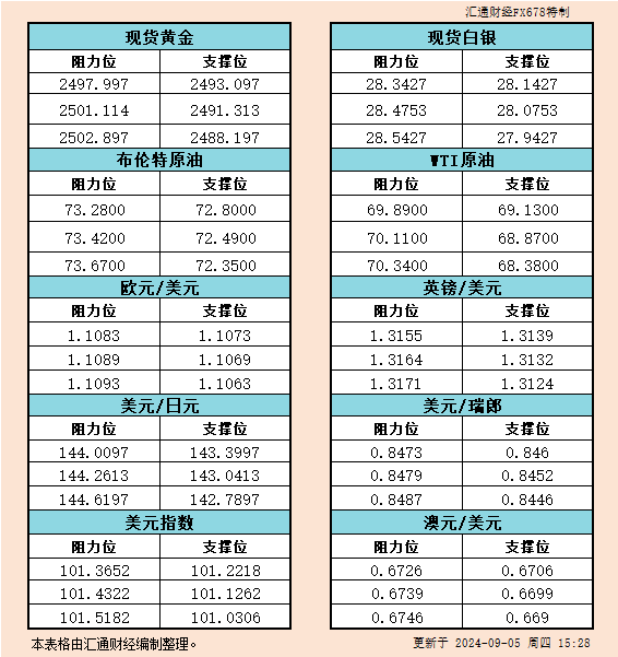 汇通财经APP讯——9月5日欧市黄金、白银、原油、美元指数、欧元、英镑、日元、瑞郎、澳元支撑阻力位一览。