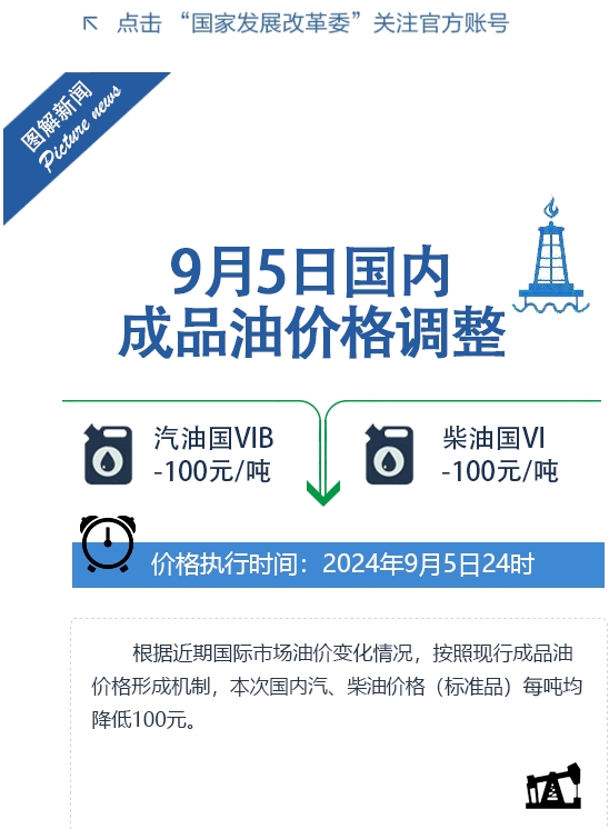 国家发改委发布消息称,自24时起,国内汽油和柴油价格均下调100元/吨。折合升价,0号柴油下调0.09元、92号汽油和95号汽油均下调约0.08元。私家车主和物流企业的用油成本将减少。以油箱容量为50升的小型私家车计算,加满一箱92号汽油将少花4元左右;对满载50吨的大型物流运输车辆,平均每行驶100公里,燃油费用减少3.2元左右。