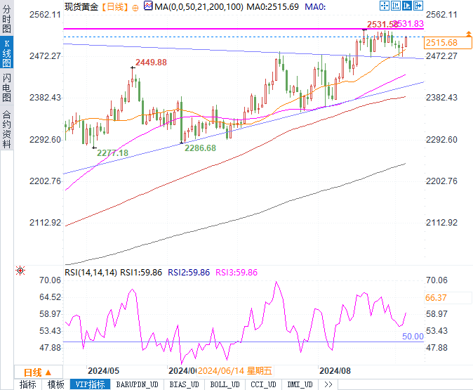 从技术面看,知名机构高级分析师Dhwani Mehta认为,黄金短期技术前景继续看涨。现货黄金价格守住21日简单移动平均线(SMA)2490美元/盎司这一关键支撑位,为看涨交易者提供了信心。14日相对强弱指数(RSI)也稳定在50水平上方,显示金价仍有上行潜力。