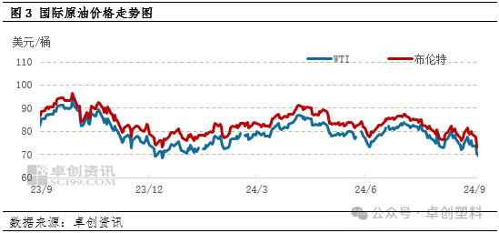 进入9月,原油价格持续走低,对市场心态及PP成本支撑逐步减弱。9月3日,因对全球需求疲软担忧加剧,利比亚各方有将达成解决争端协议的迹象,国际油价下跌4%以上,跌至去年12月份以来最低。9月4日,市场对需求的悲观情绪加深,同时对利比亚可能恢复石油出口的预期上升,WTI自去年12月份以来首次跌破每桶70美元。对比去年同期,去年9月初油价连续突破高位对行情提振明显,但今年金九开局,原油价格快速下跌对聚丙烯行情形成明显拖累。