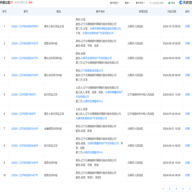 据天眼查法律诉讼信息显示,辽宁北镇锦银村镇银行股份有限公司(以下简称“辽宁北镇锦银村镇银行”)因案外人执行异议之诉被告,于2024年10月15日在北镇市人民法院开庭审理【案号:(2024)辽0782民初2784号】。