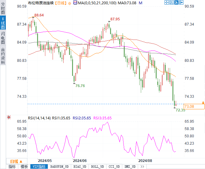 大宗商品方面,油价在周四小幅上涨。布伦特原油期货上涨0.37%,至72.97美元,而美国WTI原油期货则上涨0.38%,至69.46美元。在前一交易日中,油价曾大幅下跌,布伦特和WTI分别下跌1.42%和1.62%。全球需求不确定性以及库存增加的消息使得油价仍然承压,但短期内原油价格可能在供需两方面的变化中保持波动。