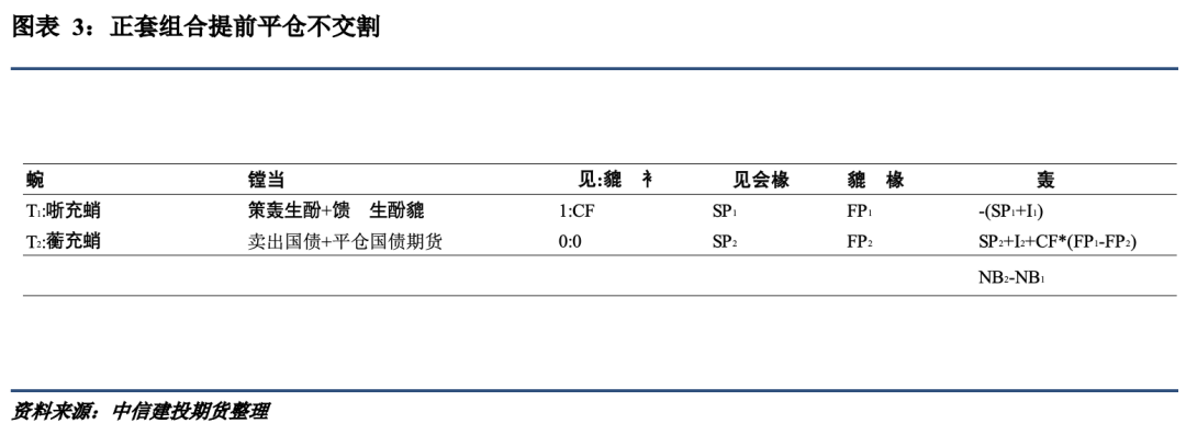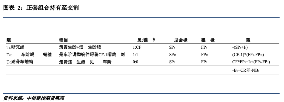 B1、NB1分别为时刻的基差、净基差, I1、I2分别为国债上一付息日至T1、T2时刻的应计利息,CR为T1至T2之间的应计利息,CF为转换因子,期末总收益为T1时刻的负净基差。只要期初净基差NB1小于0且绝对值大于交易成本C(包含冲击成本),开仓并持有至交割是划算的。