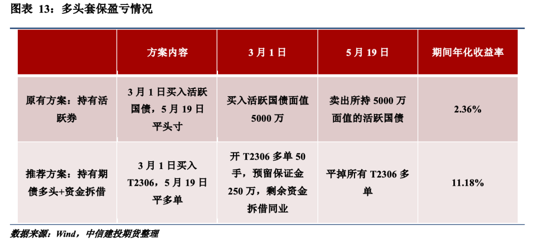 投资者计划2023年3月1日买入5000万面值的活跃国债并持有,考虑期债基差将持续收敛,我们建议其用期债多头替换现券多头,在满足保证金要求的情况下,将剩余资金用于同业资金拆借。比率计算类似空套的方式,采用久期中性法,此处重点展示结果如图13。
