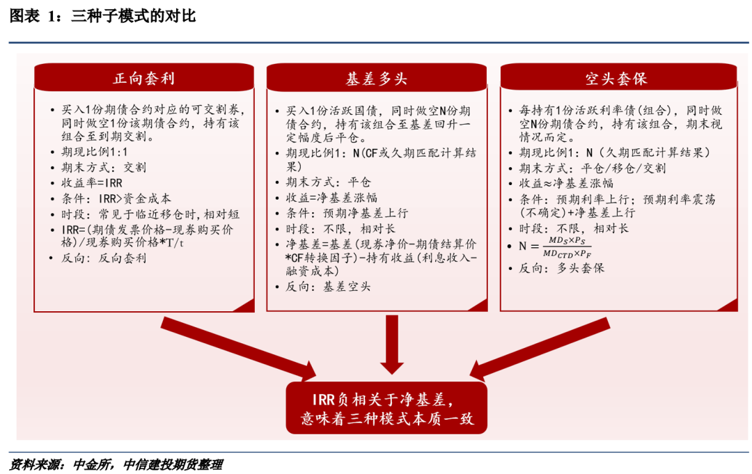 同时持有现券多头和期债空头是最典型的期现组合策略,该策略下依据参与目的和平仓方式又可分为三种模式:正向套利、基差多头和空头套保,对应的反向策略分别为反向套利、基差空头和多头套保。三种模式的对比展示于图1,可见虽然在收益率、参与条件、参与环境及关键指标等方面均略有一些差异,但最终的落脚点都在IRR和净基差这两个关键指标上。