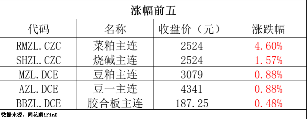 菜粕涨超4%,烧碱涨超1%,豆粕、豆一、胶合板小幅上涨。