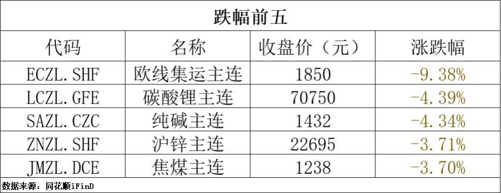 9月5日,国内商品期货多数收跌,欧线集运跌超9%,碳酸锂、纯碱跌超4%,沪锌、焦煤跌超3%;