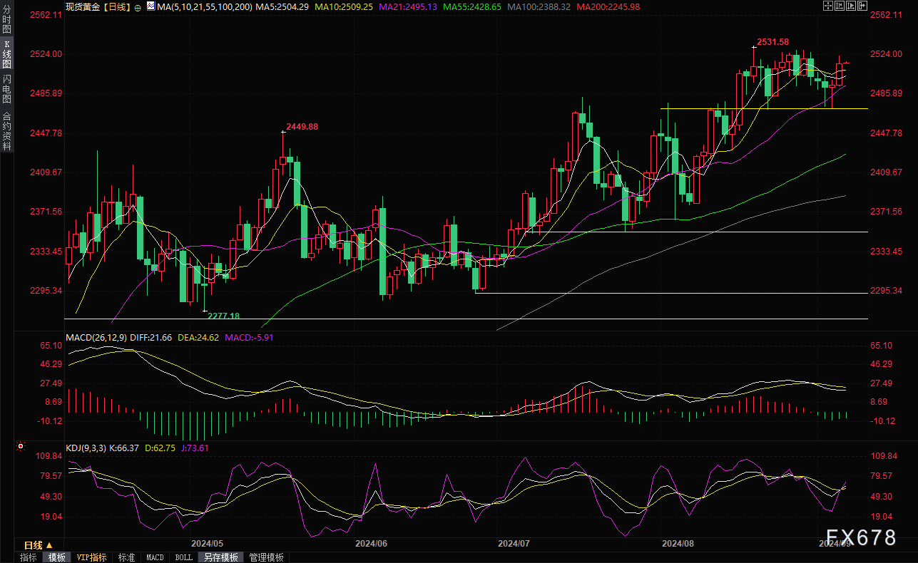 技术面来看,金价在布林线中轨附近获得支撑后再度走高,不仅收复了2500关口,而且该收复了5日均线和和10日均线,短线看涨信号有所增强,需要提防金价再度刷新历史高点的可能性。但MACD绿色柱仍在,金价仍留有高位震荡筑顶的可能性,需要提防金价冲高回落的可能性,分别关注10日均线2509.27和5日均线2504.33附近支撑。