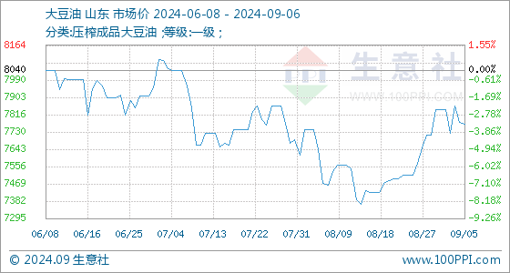 9月6日,生意社大豆油基准价为7770.00元/吨,与本月初(7842.00元/吨)相比,下降了-0.92%。