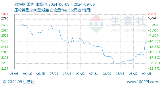 9月6日,生意社菜籽粕基准价为2510.00元/吨,与本月初(2320.00元/吨)相比,上涨了8.19%。