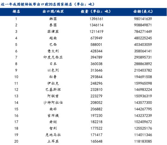 从出口国排名数据显示,近一年我国镀锌板带出口主要国家中排名第一是韩国,出口量139万吨占出口总量11%,巴基斯坦出口23.28万吨占出口总量1.83%。从出口总量看巴基斯坦占比不高,但是我国镀锌板带出口国及地区206个,巴基斯坦排名12位,排名相对靠前。