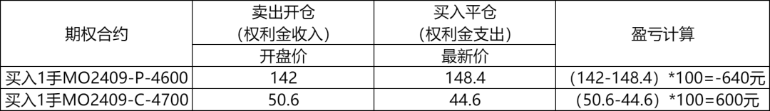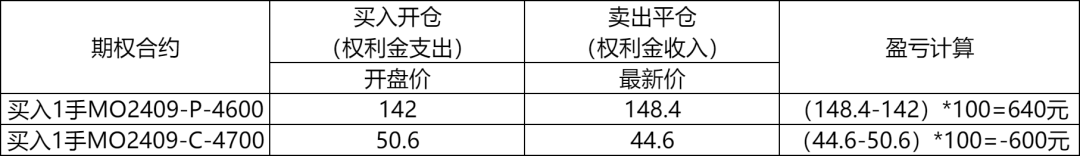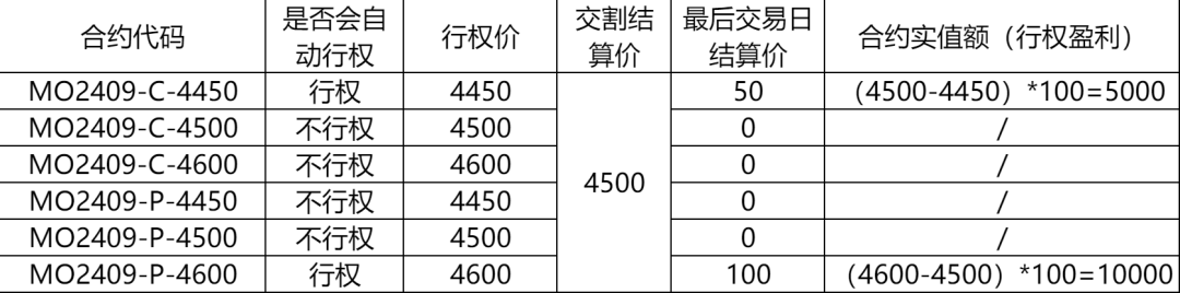 ③判断是否自动行权:由于实值额为5000元,大于行权手续费2元,合约将自动行权。不考虑手续费,行权盈利为5000元。相对应被配对履约的卖出MO2409-C-4450合约的卖方,将产生履约损失5000元。