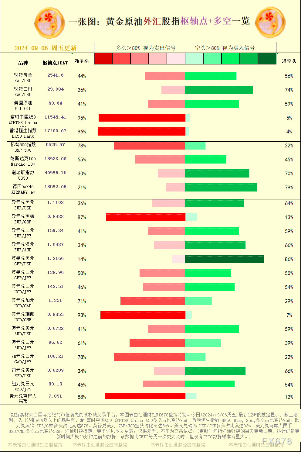 一张图:2024/09/06黄金原油外汇股指"枢纽点+多空占比"一览