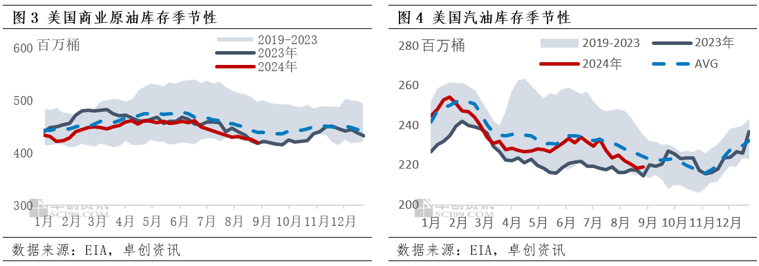 美国商业原油库存再度超预期大幅去库,库存水平降至2023年10月以来最低位。从整体库存水平来看,EIA库存数据同当天凌晨时间公布的API库存数据显示趋势基本一致,即劳工节假期前季节性去库水平。9月5日原油市场有两则利好消息,一是OPEC+核心减产8国达成协议将自愿减产措施延迟到11月底,同时超产国将弥补超产部分;另一则消息即是EIA原油库存超预期大幅去库。但从盘面来看,价格仅短时大幅拉升,随后迅速回吐当天增幅,刷新年内新低,后转为震荡微升,最终收出长上影线。OPEC+仅仅对自愿减产协议表示延长,没有改变增产的趋势,且部分超产国家对减产补偿协议的执行也难以完全落实,对扭转消费旺季结束后供应宽松预期的作用有限,市场情绪消极,因此实际提振效果不佳。