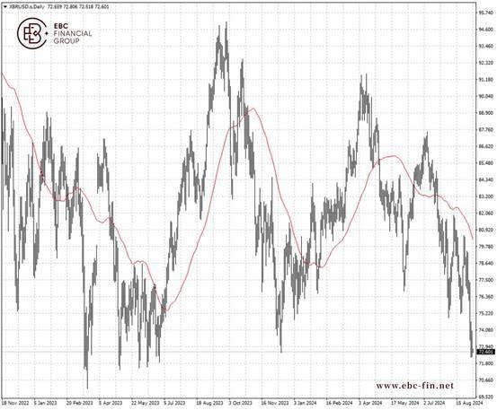 布伦特原油进一步远离50日移动均线,在72.5美元重要支撑位附近交投。现在比较可能向77美元反弹,否则预计跌破70美元。