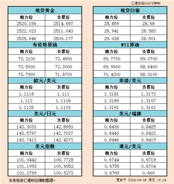 汇通财经APP讯——9月6日欧市黄金、白银、原油、美元指数、欧元、英镑、日元、瑞郎、澳元支撑阻力位一览。