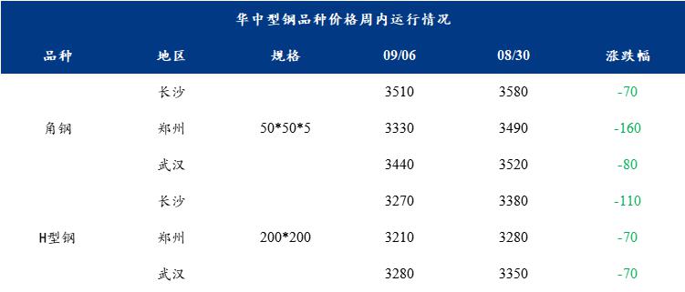 本周华中价格趋强运行,工角槽价格较上周约下跌100元/吨,H型钢价格较上周约下跌80元/吨。