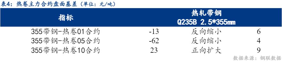 6日市场热卷01合约与355带钢价差反向缩小6元/吨,热卷05合约与355带钢价差反向缩小4元/吨。