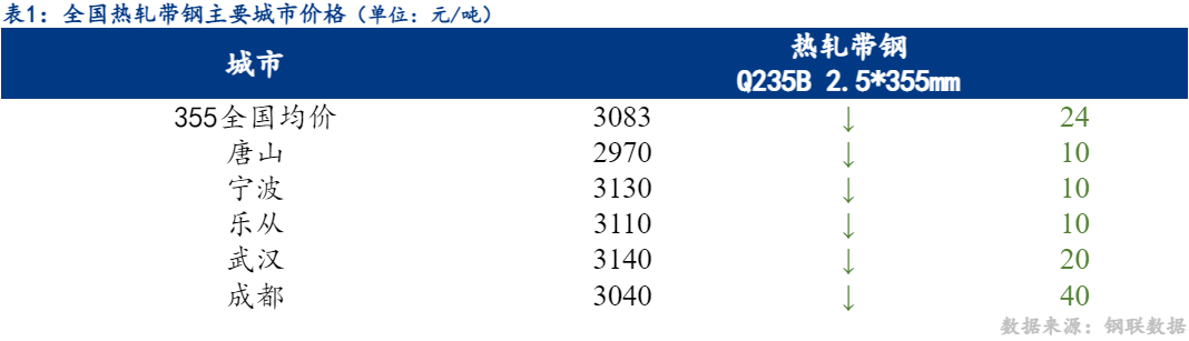 6日热轧带钢全国主要城市价格偏弱运行,截至发稿时2.5*355mm热轧带钢均价3083元/吨,较昨下降24元/吨,其中2.5*355mm主要城市报价为唐山2973元/吨,宁波3130元/吨,乐从3110元/吨。