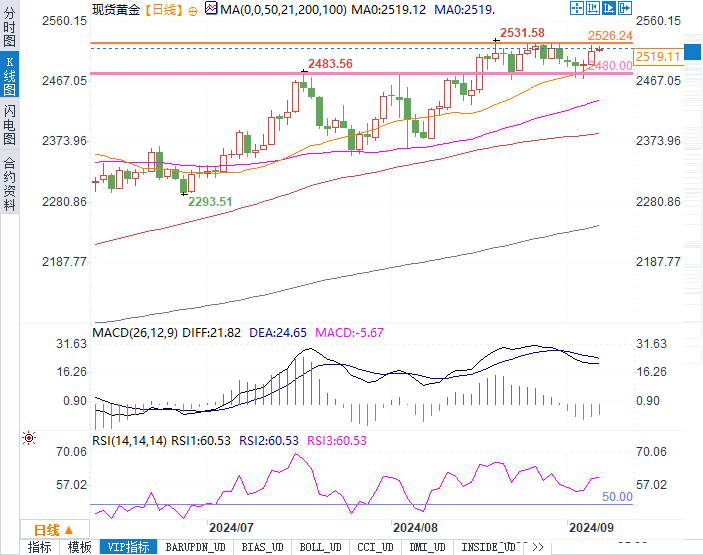 当前黄金价格维持在高位震荡格局。自本周初以来,黄金价格稳步上涨,主要是由于美国职位空缺数据的疲软推升了金价,并使其接近关键阻力位2530美元。黄金的表现通常与利率水平密切相关,在低利率环境下,黄金作为避险资产的吸引力增强。