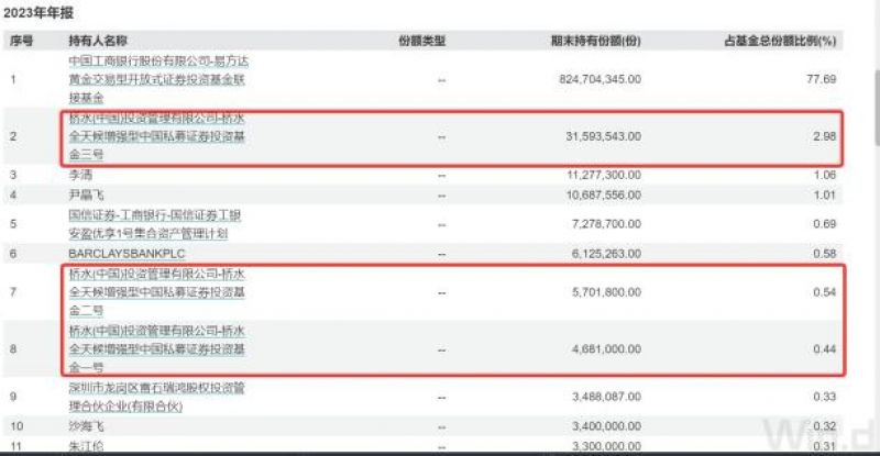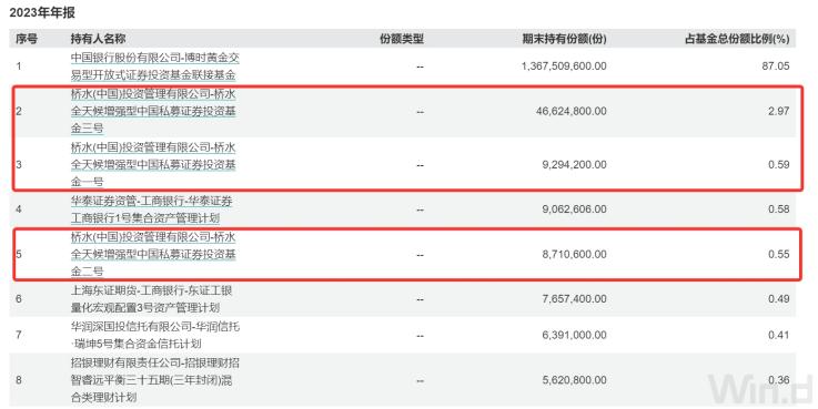 根据易方达黄金ETF2022年中报中前十大持有人明细,“桥水(中国)投资管理有限公司—桥水全天候增强型中国私募证券投资基金三号”“桥水(中国)投资管理有限公司—桥水全天候增强型中国私募证券投资基金二号”“桥水(中国)投资管理有限公司—桥水全天候增强型中国私募证券投资基金一号”新进为该基金第二大、第五大、第六大持有人,持仓份额分别为3159.35万份、570.18万份、468.1万份,合计持有4197.63万份。