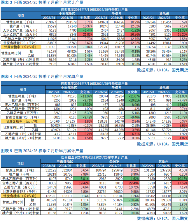 UNICA协会发布的数据显示,7月下半月巴西中南部地区糖产量为361万吨,同比下降2.16%;巴西中南部地区甘蔗压榨量为5131万吨,同比下降3.35%;乙醇产量为25.5亿公升,同比增长3.47%。产量数据符合或略高于市场预期。有机构此前的调查预估糖产量为360万吨,甘蔗压量为5080万吨。远期巴西的产量存在修正的可能,年初给予的巴西新季较高的制糖比可能需要调整。