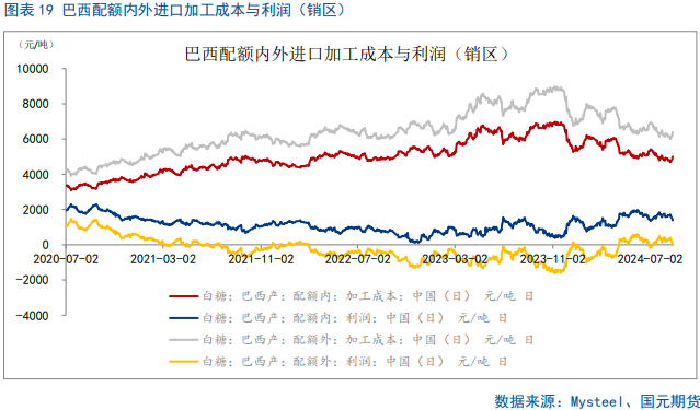 进口利润:中性偏多。进口利润受原糖价格变化的影响而被动波动。目前巴西配额外进口基本无利润窗口。