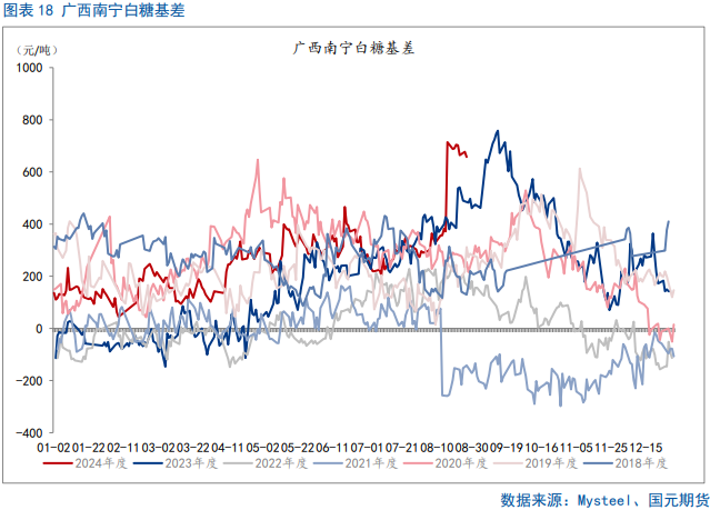 现货价格方面,8月中旬出现了比较明显的调价,8月底现货价格稍有所回升。截至8月27日,广西制糖集团报价区间为6230-6360元/吨,少数上调20-30元/吨;云南制糖集团报价区间为6030-6090元/吨,上调10-20元/吨;加工糖厂主流报价区间为6350-6410元/吨,调整20元/吨,涨跌不一。现货报价有所回暖,询价略有增加,但市场采购心态仍相对谨慎,成交以刚需为主,整体一般。主力合约基差方面,从8月初的296元/吨上升至657元/吨。