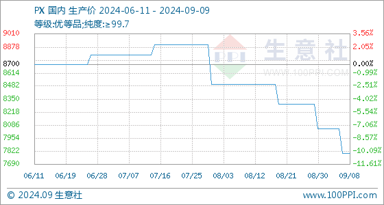 9月9日,生意社PX基准价为7800.00元/吨,与本月初(8050.00元/吨)相比,下降了-3.11%。