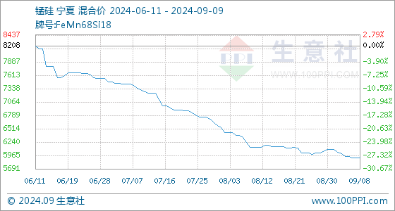 9月9日,生意社锰硅基准价为5920.00元/吨,与本月初(6082.00元/吨)相比,下降了-2.66%。