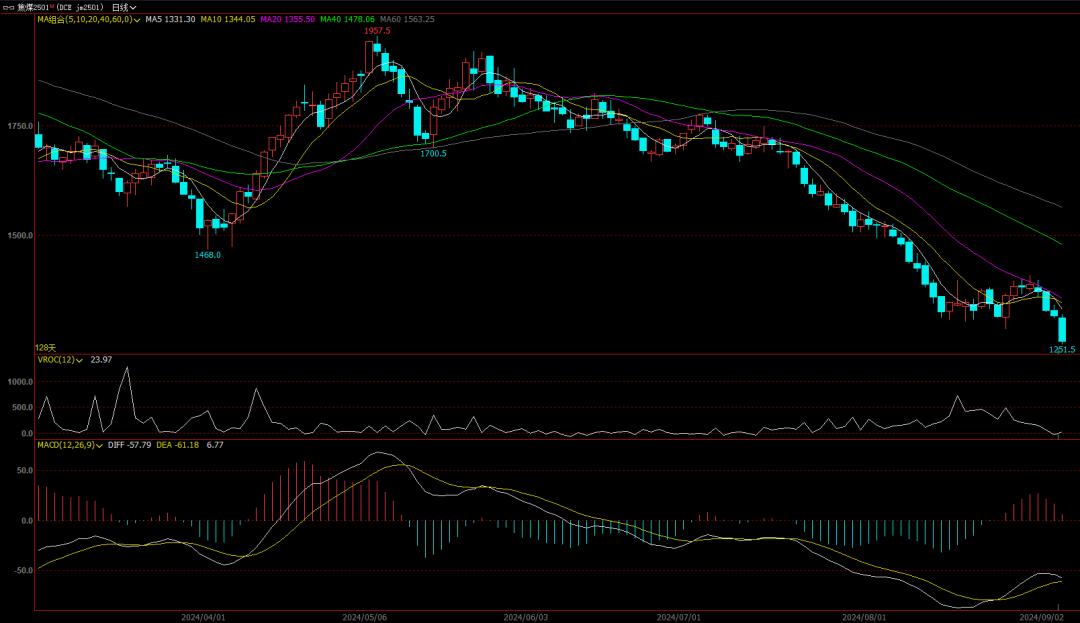 近日黑链品种在市场氛围带动下叠加旺季不及预期大幅下挫,且双焦需求端下行驱动明显,焦煤期货跌幅超5%最低跌至1251。