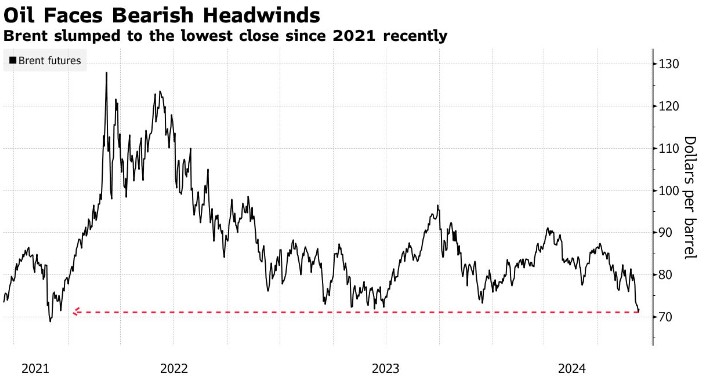 摩根士丹利对前景的重新思考,得到了其它主要银行的呼应。高盛上个月下调了油价预期,而最近花旗表示,市场看起来供过于求,除非OPEC+进一步减产,否则到2025年油价可能平均每桶60美元。布伦特原油上周下跌近10%,周一交易价格接近每桶72美元。
