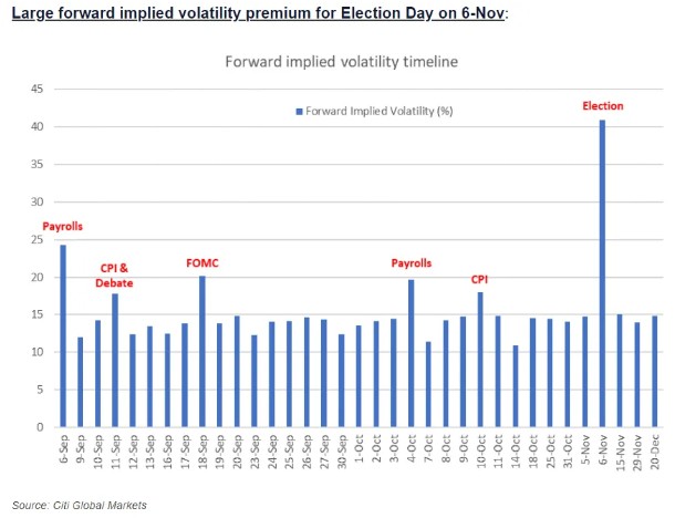 花旗全球市场美国股票交易策略主管Stuart Kaiser在一份报告中写道:“选举结果很可能是50/50的胜负,因此我们将专注于持有波动性,而不是方向性观点。”“隐含波动性往往会在选举日临近时上升,如果波动性在下个月有所缓解,我们会趁机买入期权,或者交易日历价差以降低成本。”