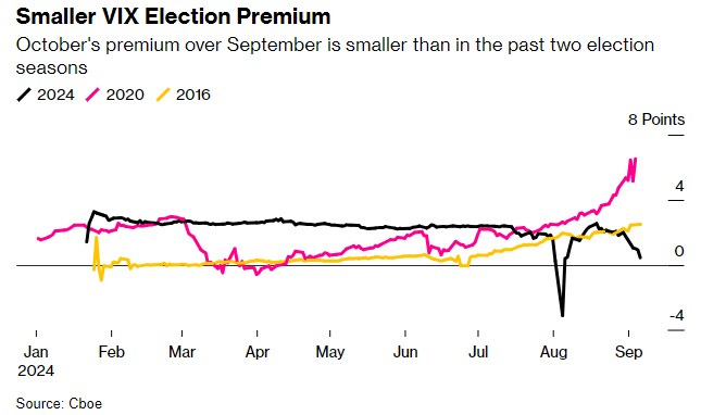 华尔街备受关注的恐慌指数芝加哥期权交易所波动率指数(VIX)的合约看起来比四年前更为温和。VIX远期曲线显示出的“扭曲”程度有所减弱,10月期货(衡量11月标普500指数期权的波动性)相对于9月和11月合约的溢价远低于2020年或2016年。