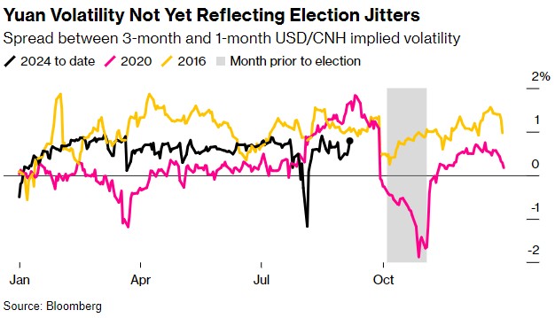 为了衡量货币市场上的选举风险溢价,交易员现在可以查看给定汇率的三个月隐含波动率(捕捉11月5日的投票日)与一个月期限(尚未捕捉)之间的差异。