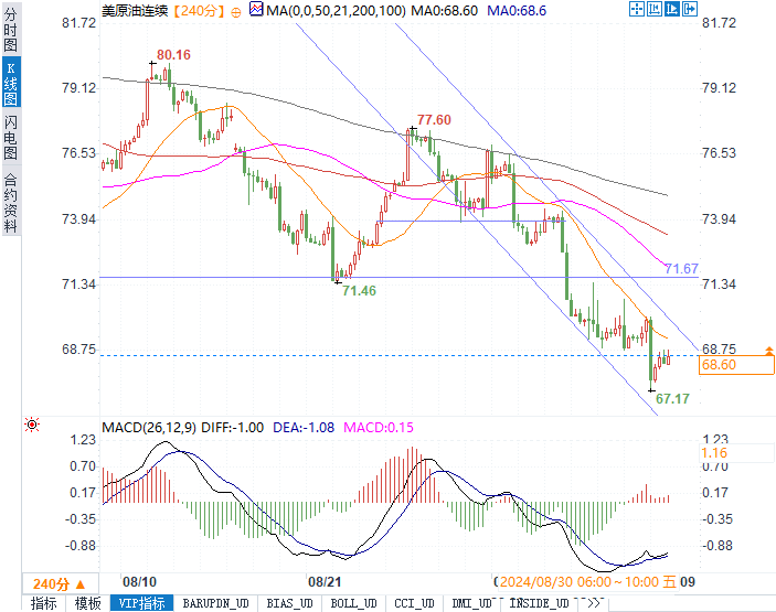 根据分析师最新的技术面分析,WTI原油期货在触及67.65的支撑位后,出现了强劲反弹,并接近看跌通道的阻力位。目前,市场观望情绪较浓,需等待价格进一步突破69.75的阻力位或跌破68.00的支撑位,才能获得更明确的方向信号。如果价格突破69.75,则有望进一步上涨,目标价位为71.70;反之,若跌破68.00,则下行目标位将锁定在66.75,甚至可能继续测试65.50这一更低水平。